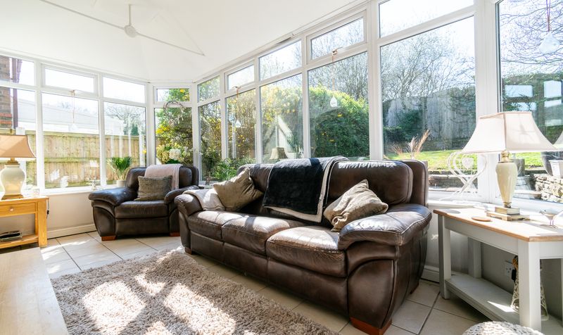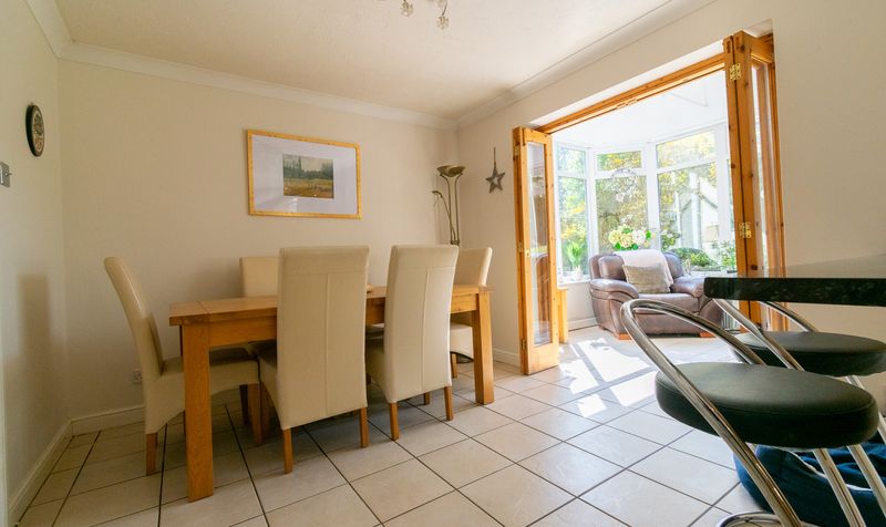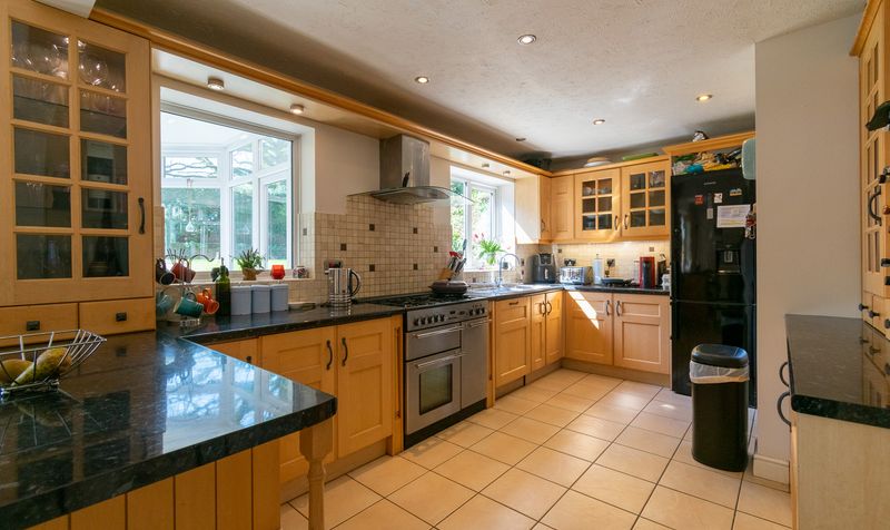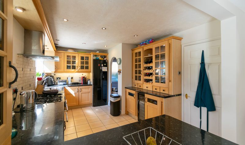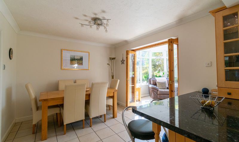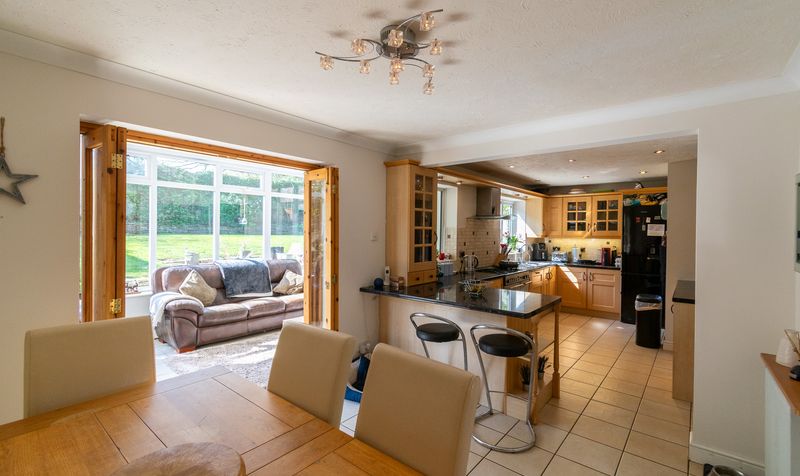 At the heart of the home lies the stunning open-plan kitchen and dining area-a true hub for family life and entertaining. The kitchen is well-equipped with a wide range of solid wood units, gleaming granite worktops, and integrated appliances including a range cooker, wine cooler, and contemporary extractor hood. A breakfast bar adds further seating and functionality, while tiled flooring and recessed lighting offer a clean, modern finish. The adjacent dining area comfortably accommodates a large table, and bi-fold doors open onto the bright conservatory, which in turn provides uninterrupted views of-and access to-the beautiful garden. A separate utility room, discreetly located off the kitchen, enhances the home’s practicality.