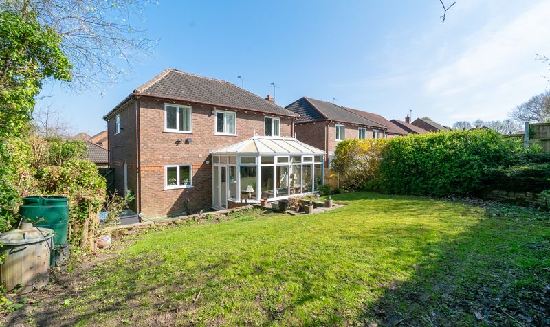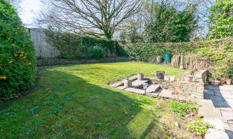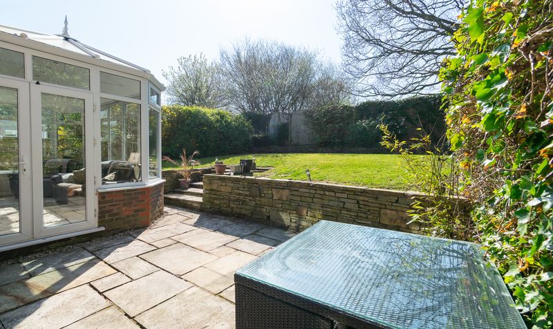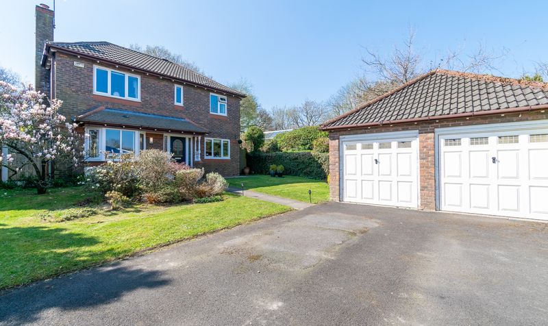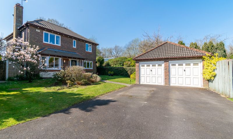 Externally, the property is set back from the road behind a private driveway that offers ample off-road parking and access to a detached double garage. The front gardens are attractively landscaped, adding to the home’s kerb appeal, while the rear garden is a peaceful and beautifully maintained space. Featuring a raised lawn framed by mature hedges and trees, it offers a wonderful sense of privacy. A stone-flagged patio area provides an ideal spot for outdoor dining and entertaining.