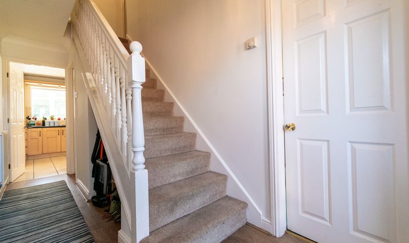 Upon entering, you’re welcomed into a bright and spacious hallway featuring soft neutral tones, wood-effect flooring, and a classic spindle staircase that sets the tone for the rest of the home. Ample natural light filters through, creating a warm first impression, while practical understairs storage adds everyday functionality. Doors lead off to the principal ground floor rooms.