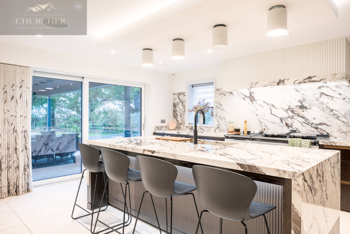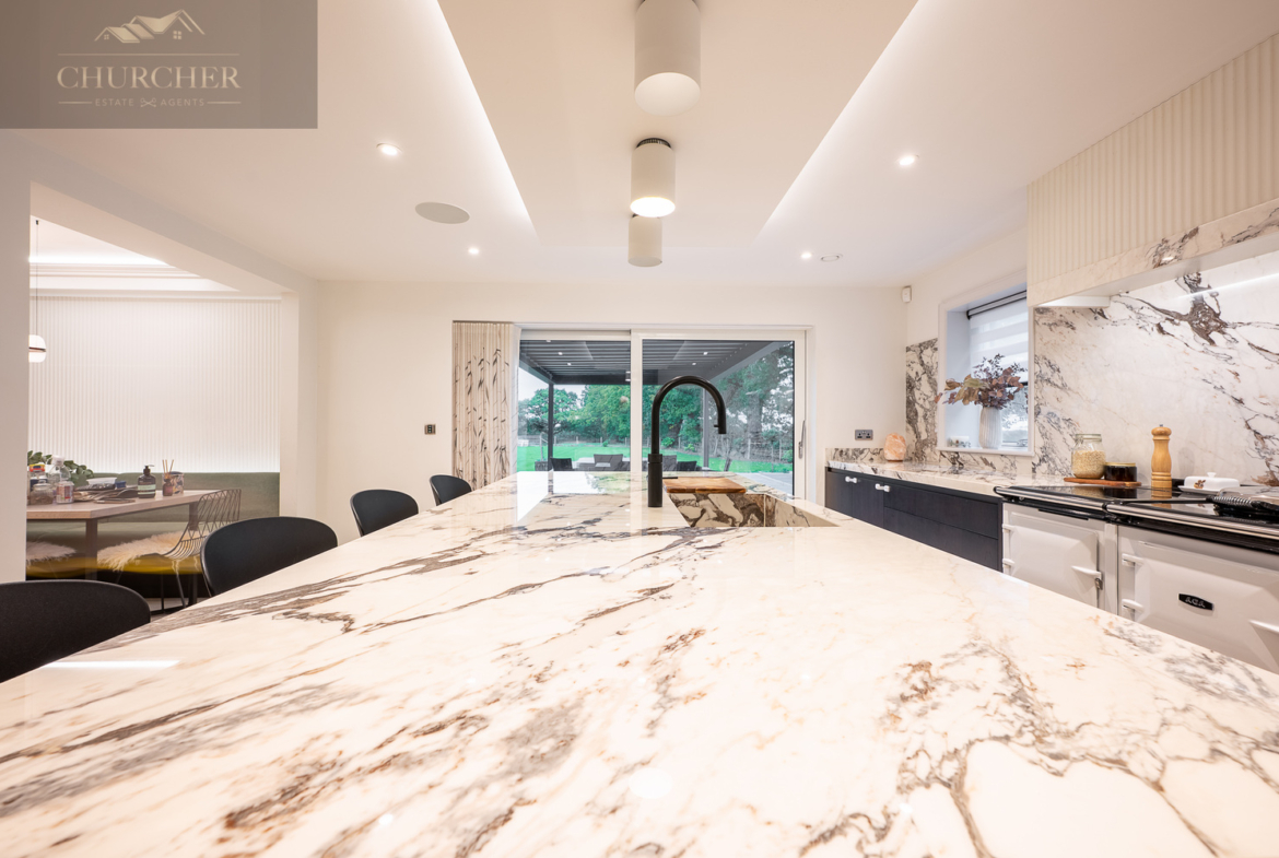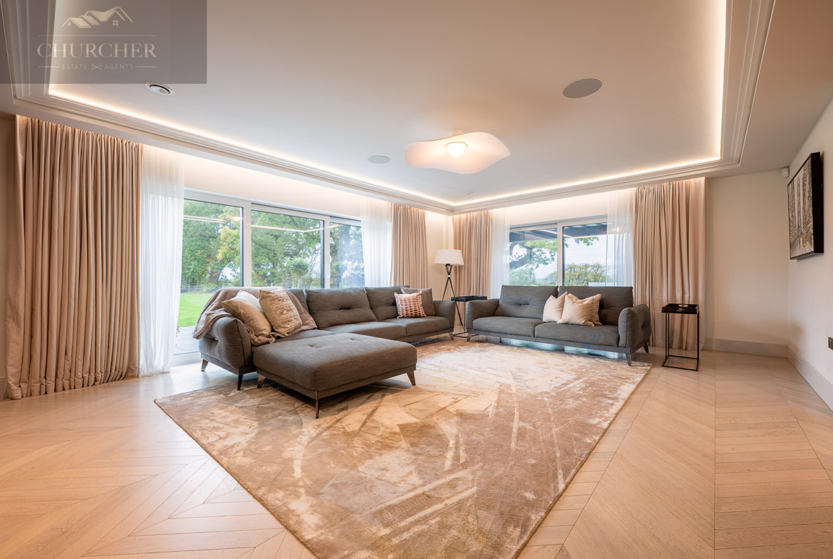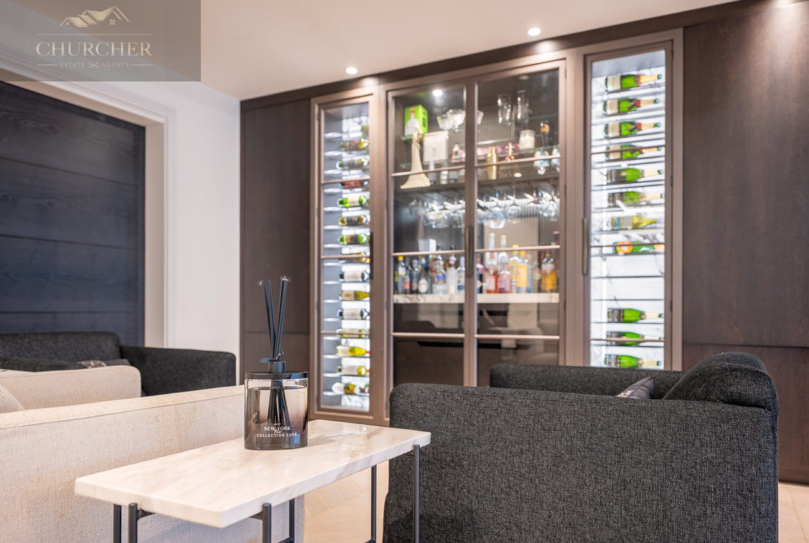 The main lounge exudes understated luxury, with soft neutral tones, ambient ceiling lighting, and panoramic glazing that frames sweeping garden and countryside views. A bespoke media wall and contemporary furnishings create a calm yet refined environment, ideal for relaxed evenings with friends or family. Perfect for both entertaining and unwinding, the lounge is complemented by an elegant bar area, complete with glass-fronted cabinetry, dual wine storage, and marble accents. Whether hosting evening drinks after a day at the golf or enjoying quiet conversation by candlelight, this space defines modern country elegance.