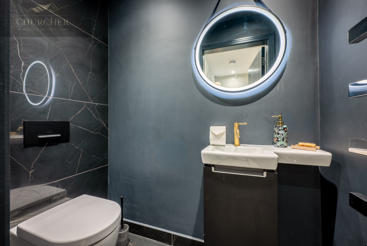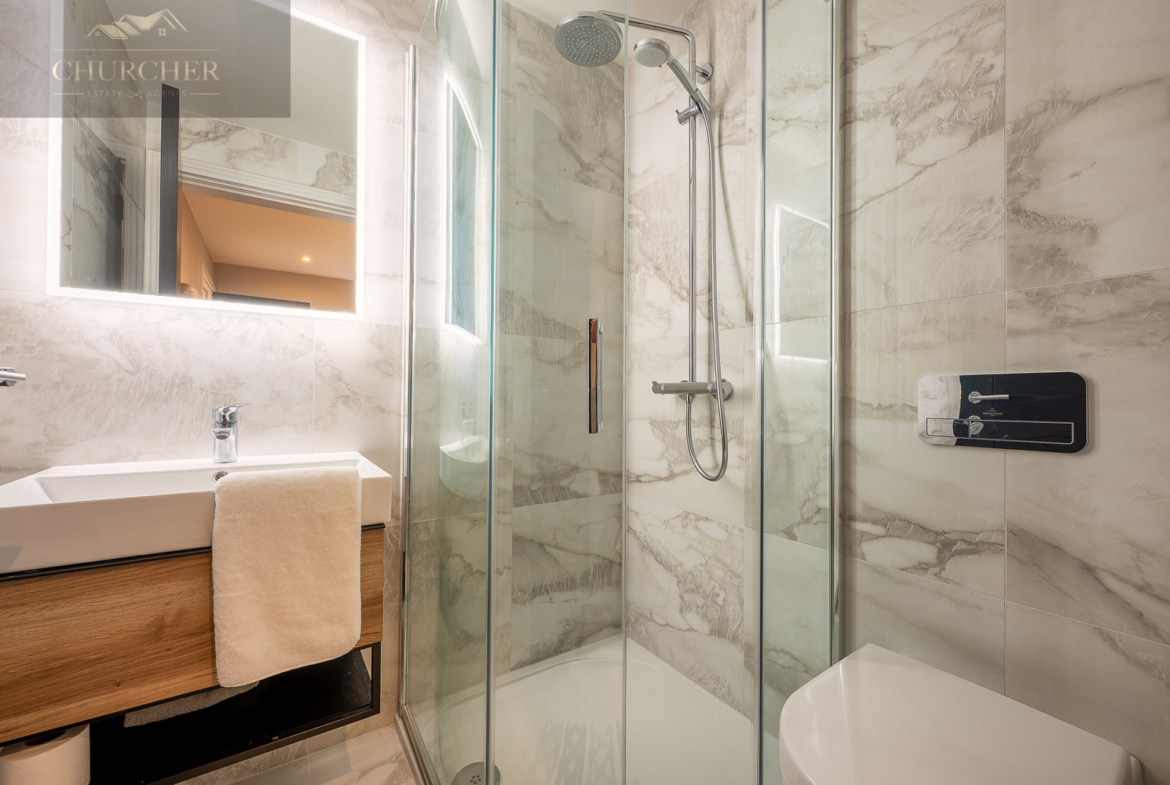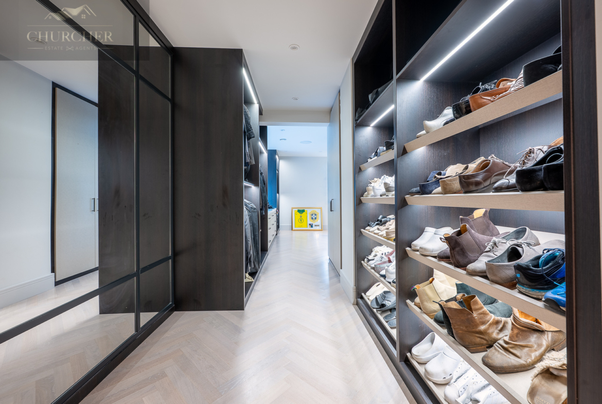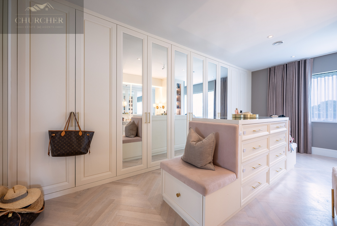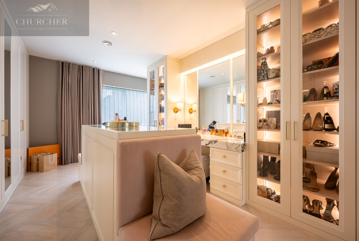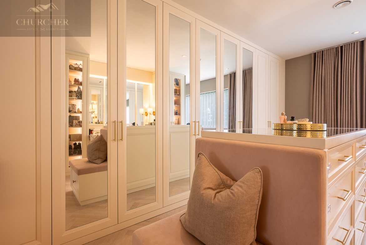 Adjoining this tranquil retreat lies the (Her) boutique-style dressing room, a true showpiece of craftsmanship and design. Bespoke mirrored cabinetry, illuminated display shelving and a central island with built-in seating transform this space into a luxury experience all of its own. Every detail has been considered – from the integrated vanity with marble countertop to the soft lighting that highlights each curated wardrobe and collection. It offers the perfect setting for preparing for a gala evening, dining out in the village, or hosting guests back at the property.