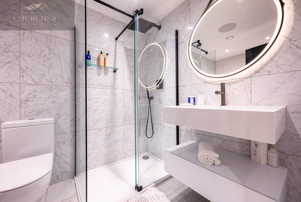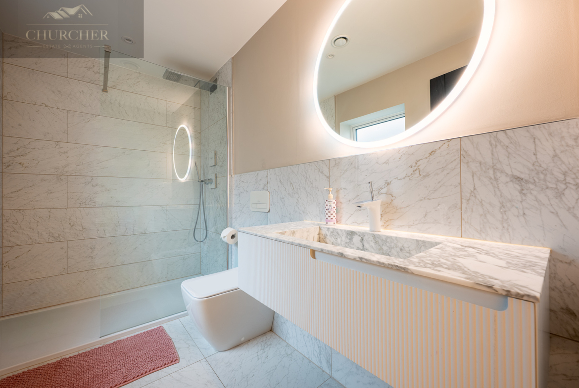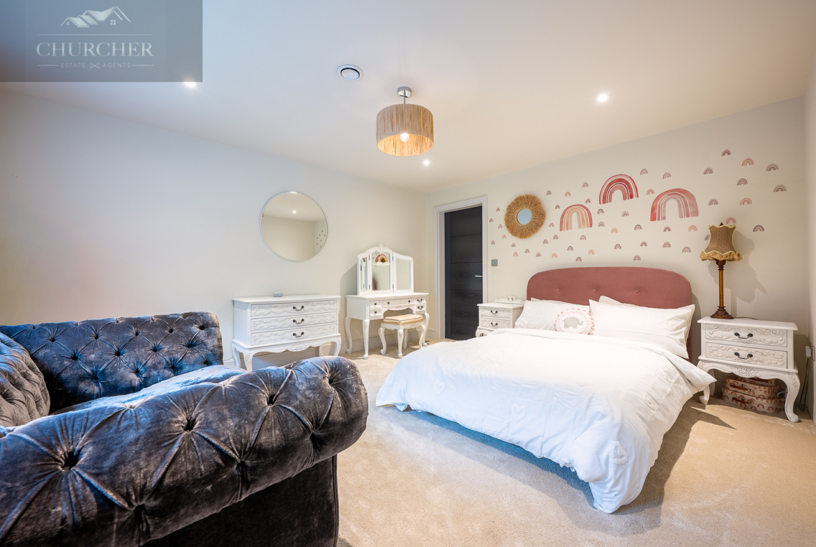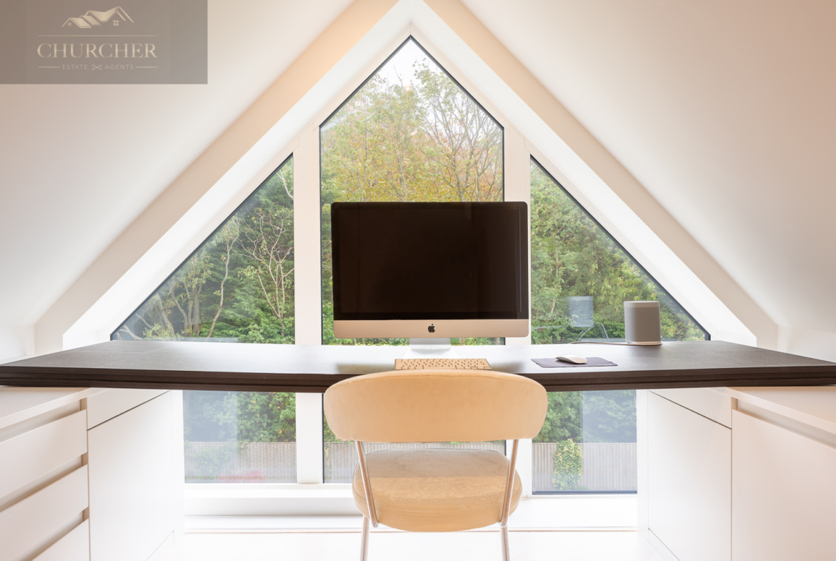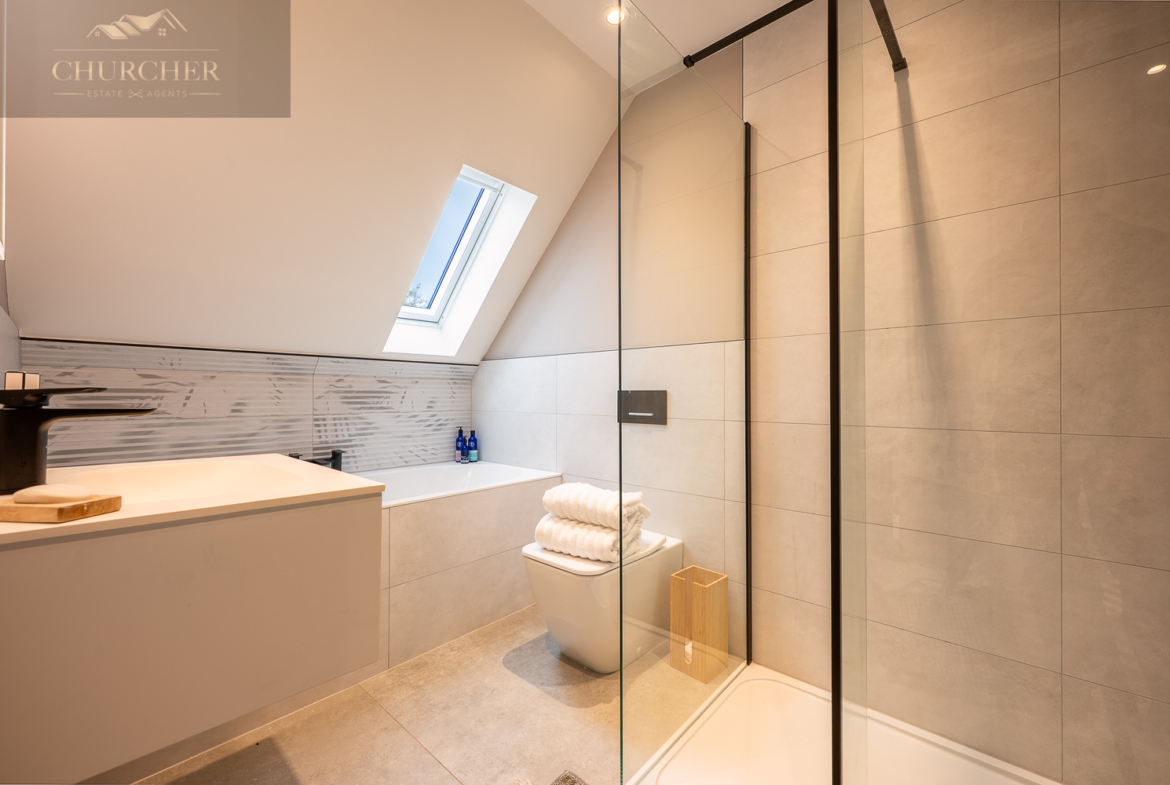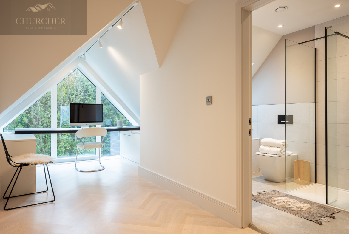 Adjacent to this, a bright home office framed by a striking gable window provides inspiring garden views and an abundance of natural light. Perfectly equipped for those who wish to stay connected while away, this tranquil workspace can also be transformed into an additional bedroom if required, maintaining flexibility for larger groups or visiting guests. Completing this floor are another two beautifully appointed bedrooms and a contemporary family bathroom, styled with sleek porcelain tiling, a walk-in shower, and luxurious fittings – ensuring every inch of this upper level delivers the same high level of refinement found throughout the home.