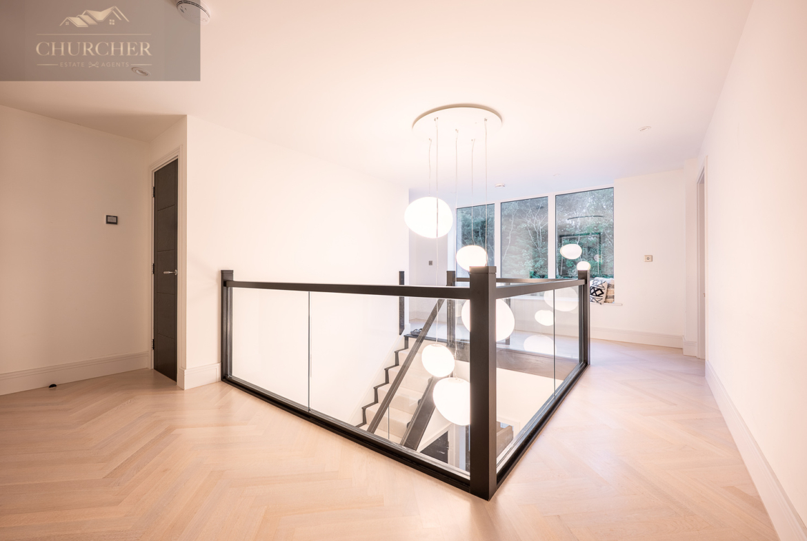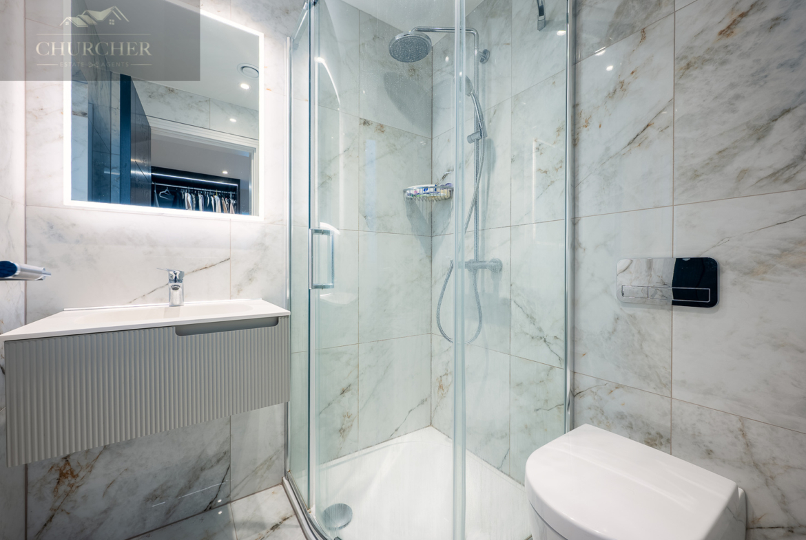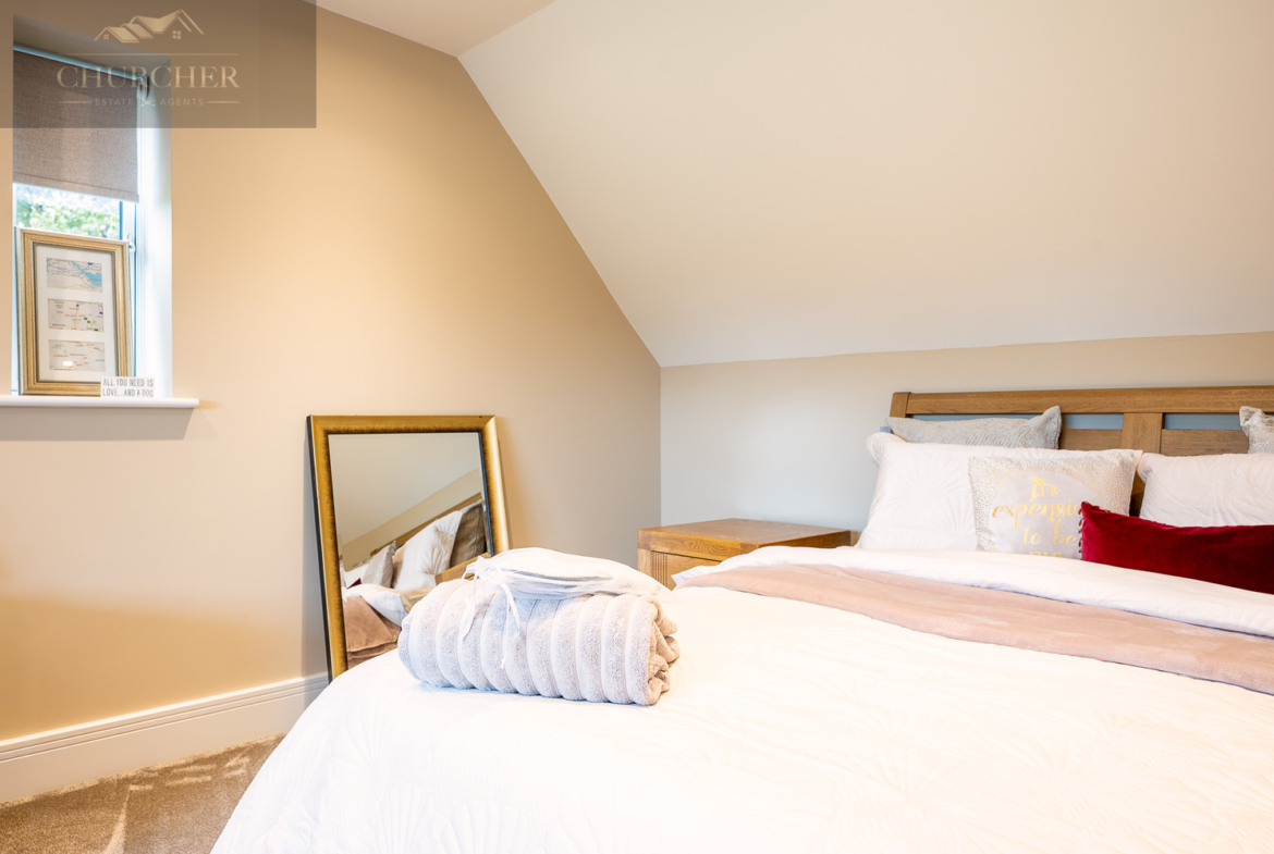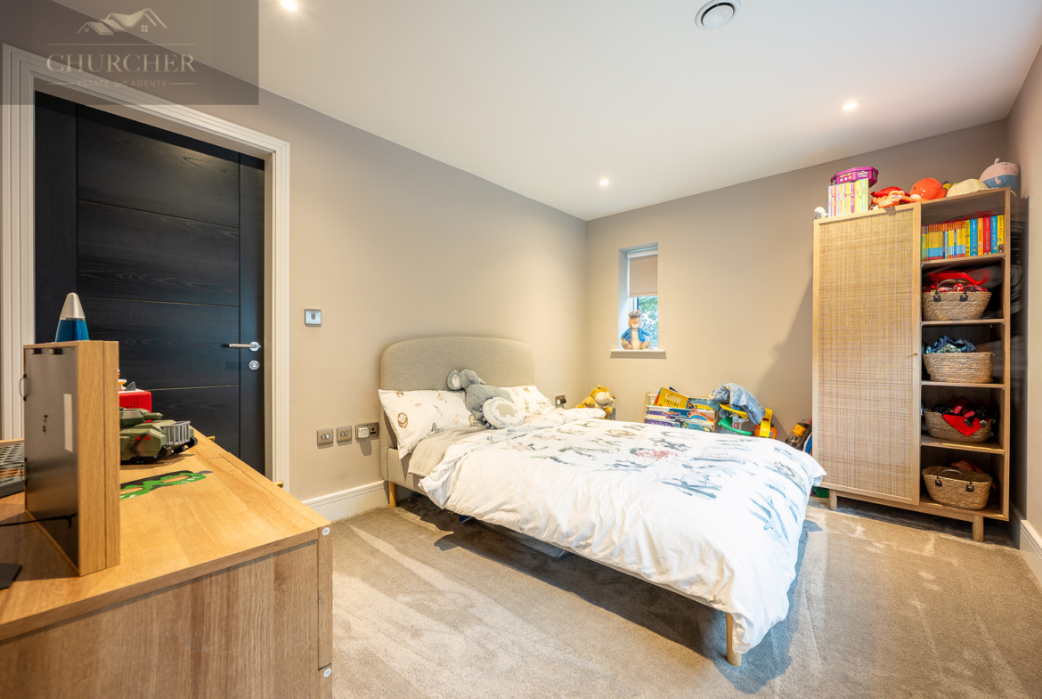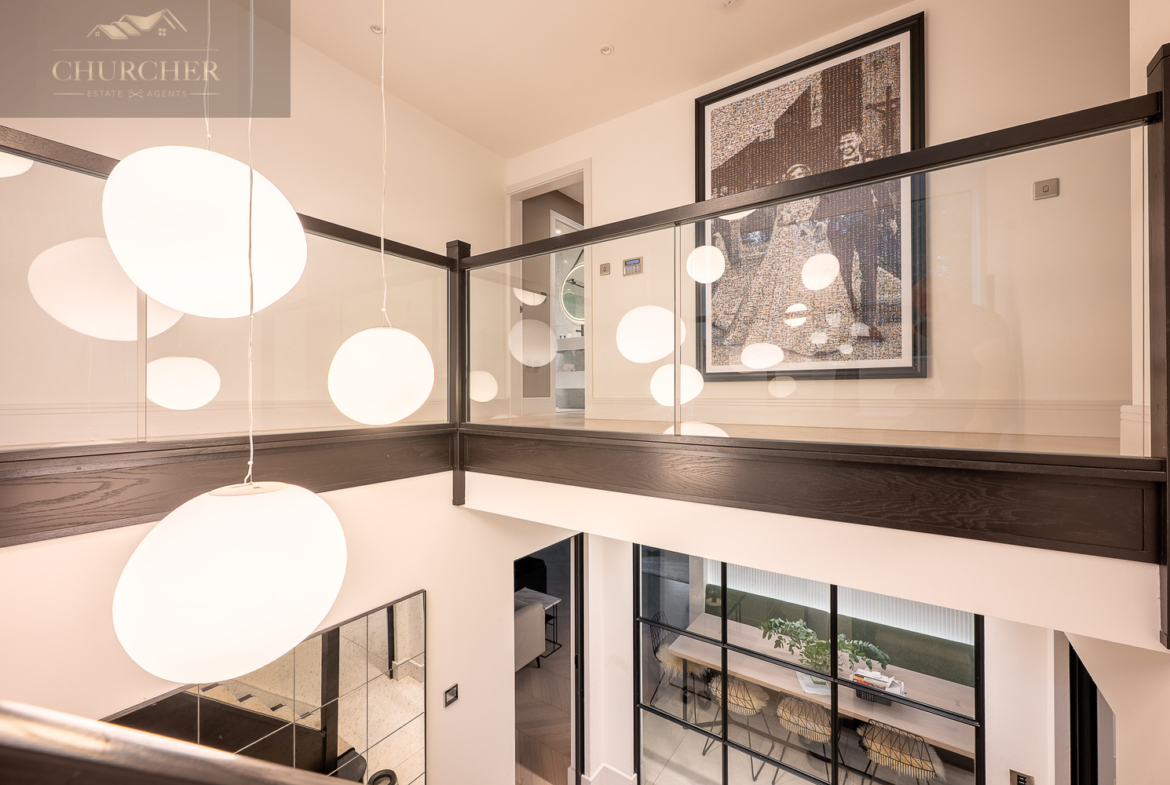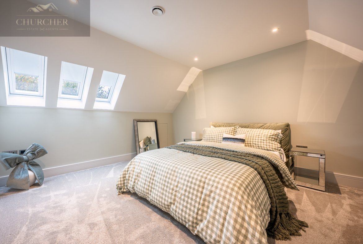 Adjacent to this, a bright home office framed by a striking gable window provides inspiring garden views and an abundance of natural light. Perfectly equipped for those who wish to stay connected while away, this tranquil workspace can also be transformed into an additional bedroom if required, maintaining flexibility for larger groups or visiting guests. Completing this floor are another two beautifully appointed bedrooms and a contemporary family bathroom, styled with sleek porcelain tiling, a walk-in shower, and luxurious fittings – ensuring every inch of this upper level delivers the same high level of refinement found throughout the home.