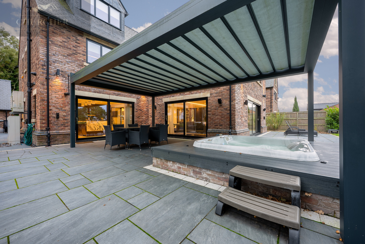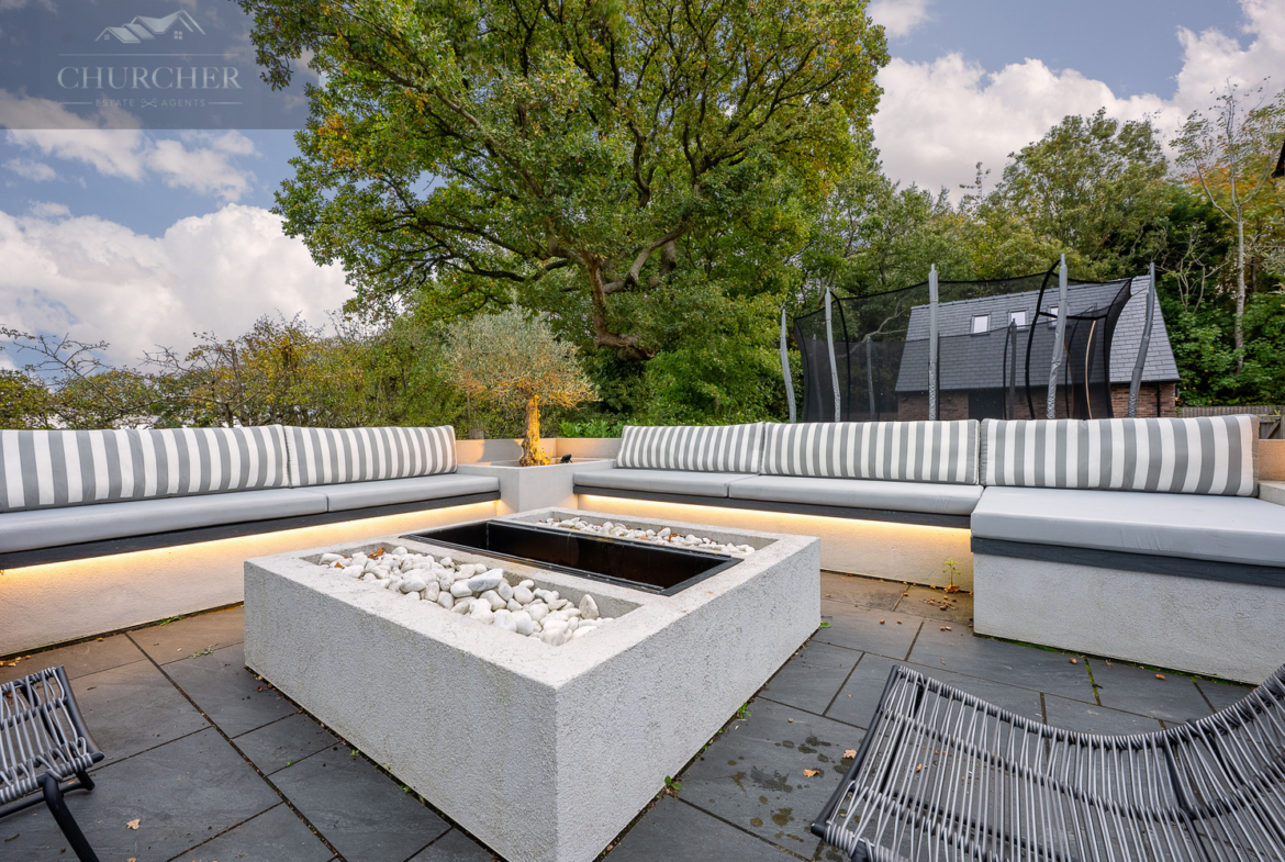 Outside, the landscaped gardens have been designed for both celebration and serenity. Expansive porcelain terraces spill out from the living areas, creating a seamless flow for outdoor entertaining. A covered seating zone houses a luxury hot tub, providing the ideal spot to relax with a glass of champagne under the stars or enjoy a peaceful morning soak before play begins. A large, in-built L-shaped seating area surrounds a contemporary fire pit, offering the perfect setting for evening gatherings beneath the night sky, with plenty of logs provided for effortless enjoyment. Beyond, manicured lawns and mature trees offer privacy and picturesque views of the surrounding countryside. The home provides ample parking and a detached double garage with home gym equipment, ensuring complete convenience and discretion.
