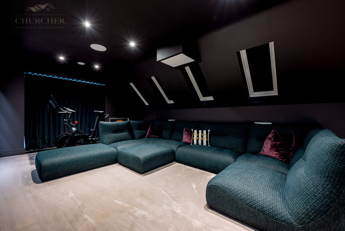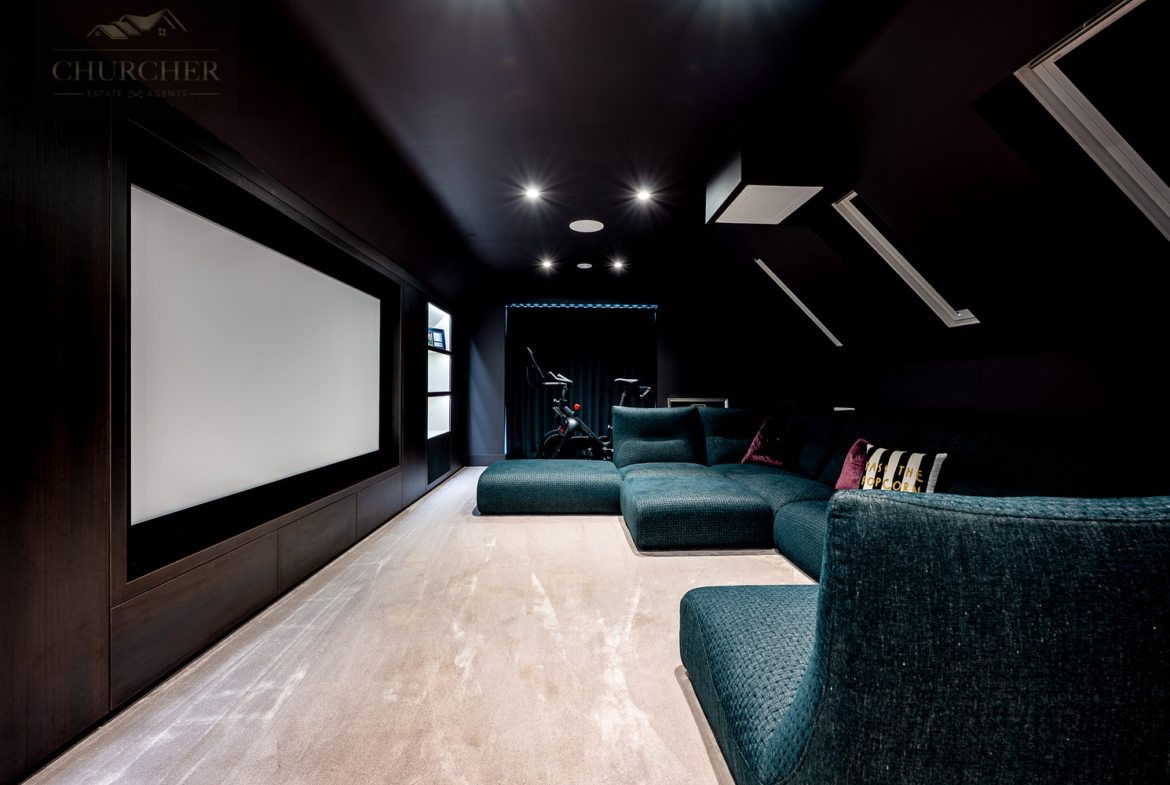 The uppermost floor continues to impress, combining versatility, indulgence, and privacy in equal measure. A dedicated cinema room sets the tone for relaxed evenings and social gatherings, with rich, dark interiors, plush modular seating, and a built-in widescreen projection system that invites guests to unwind in style – whether enjoying a classic film, celebrating the day’s play, or simply retreating into comfort after a long afternoon at Royal Birkdale.