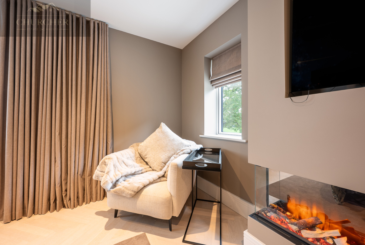 Ascending to the first floor, the sense of indulgence deepens. The main bedroom is a serene sanctuary, thoughtfully positioned to capture sweeping countryside views through large picture windows that fill the space with soft morning light. This beautiful bedroom combines warmth and modern elegance, with muted tones, layered textures and ambient lighting creating an atmosphere of calm sophistication. A statement feature fireplace sits beneath a wall-mounted television, adding both comfort and contemporary style – the perfect spot to unwind after a day at the course, glass in hand, while the sun sets over the fields beyond.