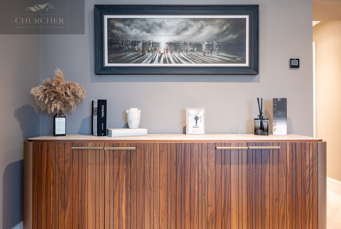 The open-plan kitchen and living area forms the true heart of the home – a striking social hub designed with the entertainer in mind. The sleek, handcrafted kitchen by Hetherington Newman features marble-effect surfaces, a large central island, and a statement AGA, perfectly complemented by a stylish dining area and glass doors that open directly onto the garden terrace. It’s the ultimate space for hosting pre- or post-tournament gatherings, private dining, or informal breakfasts before heading to the course. Completing the ground floor is a stylish WC and a well-appointed utility room with external access.