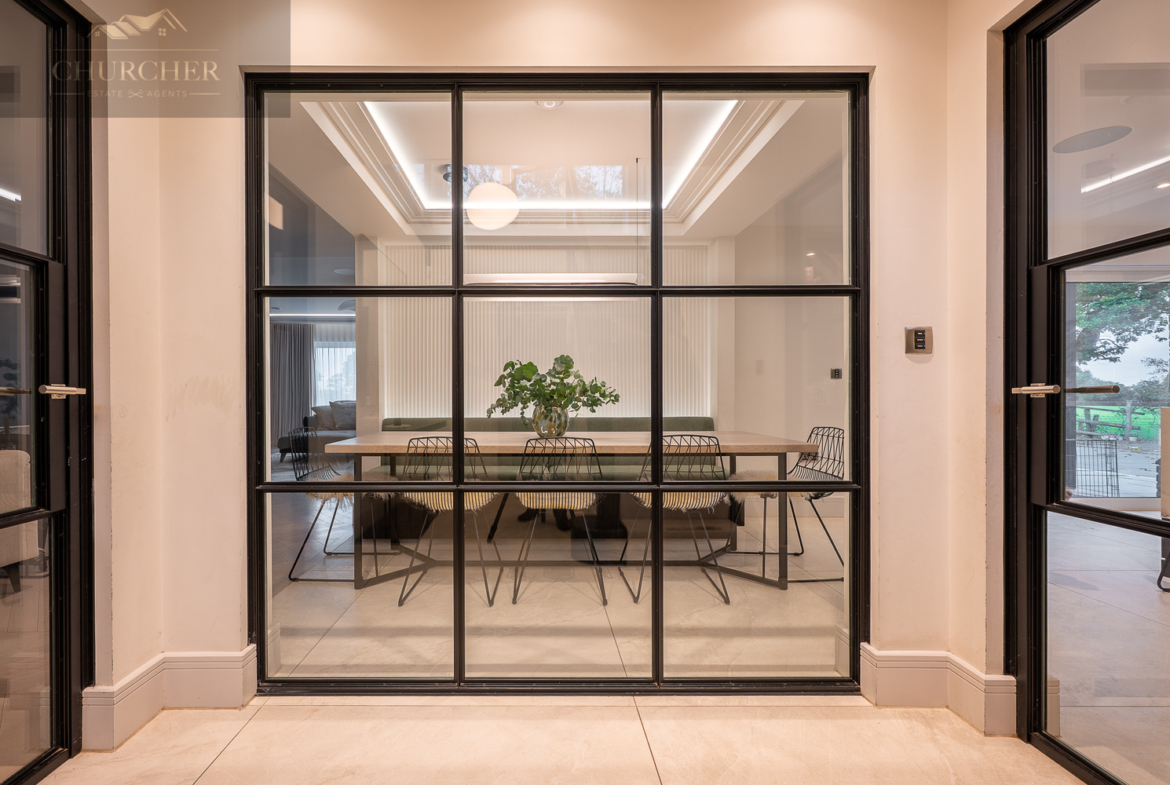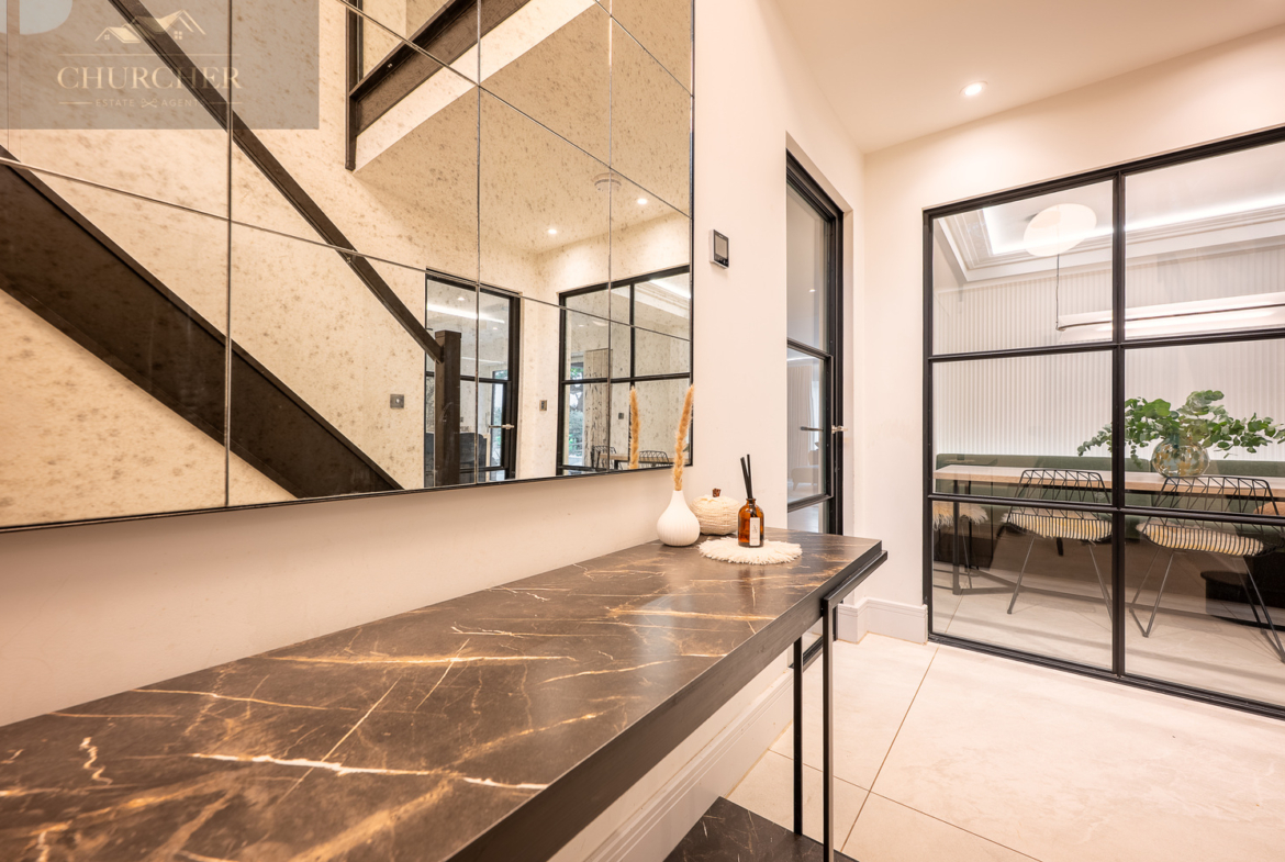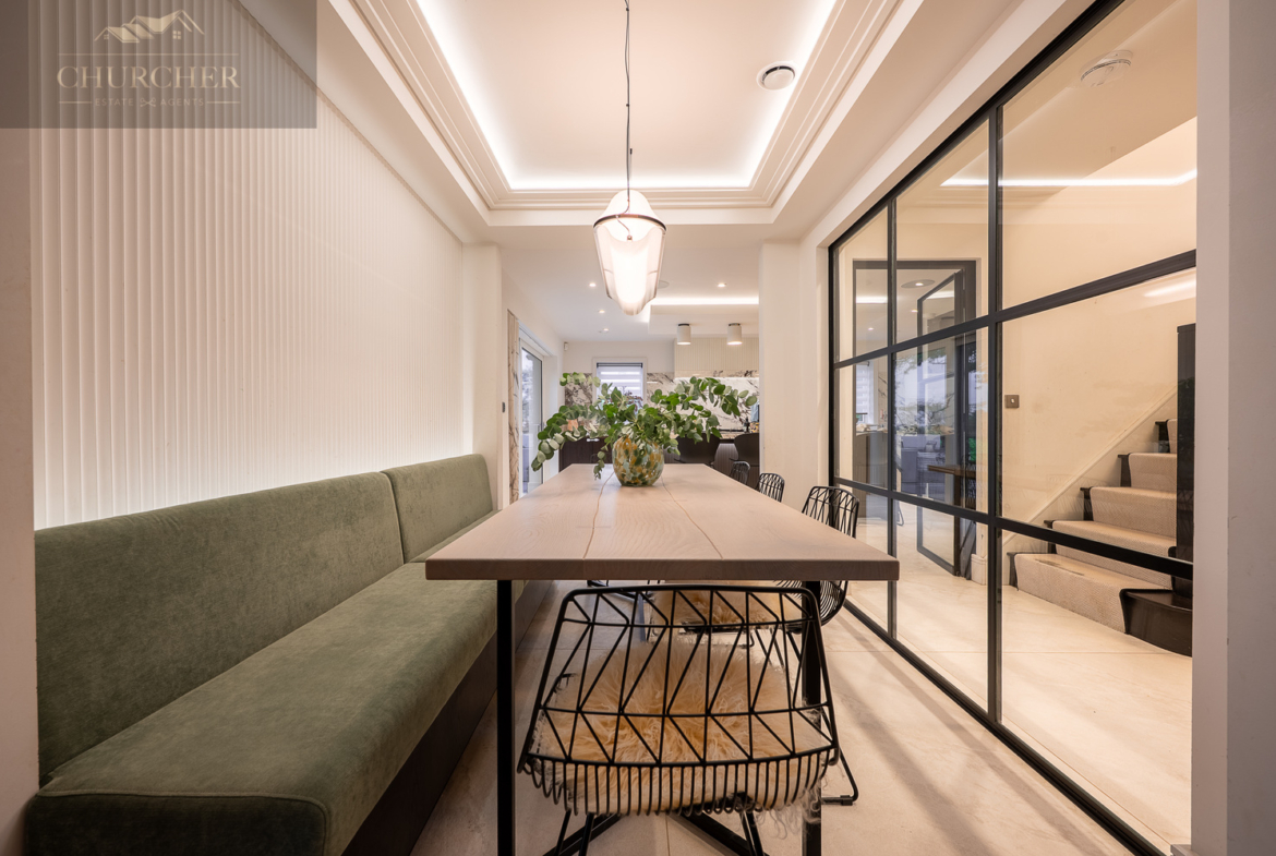 Designed for both entertaining and unwinding, the home flows effortlessly through luxurious, light-filled living spaces. The property opens into a striking reception hall, setting the tone for the elegance that continues throughout. Crittall Glass-panelled partitions and mirrored detailing flood the space with light, while soft neutral tones and contemporary finishes create a calm and welcoming first impression. To one side, the formal dining area sits beautifully framed behind glass double doors, a chic, social space with built-in banquette seating and ambient lighting, perfect for intimate dinners or lively entertaining.