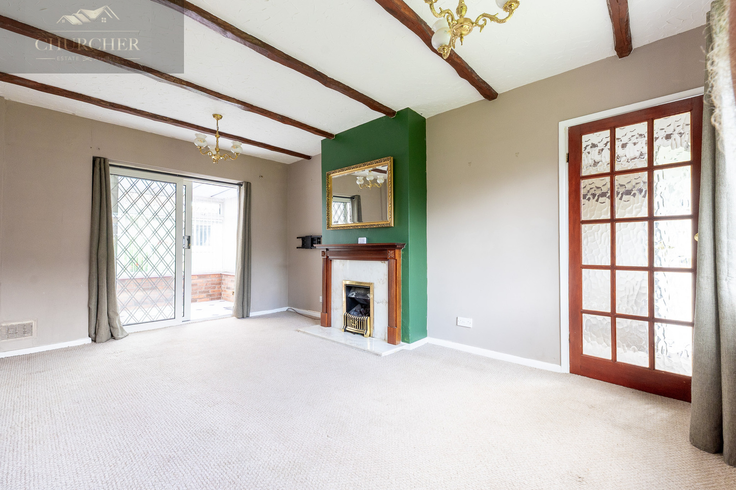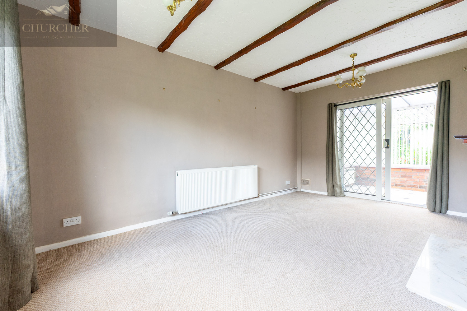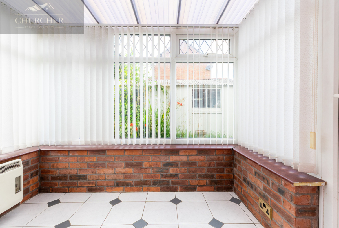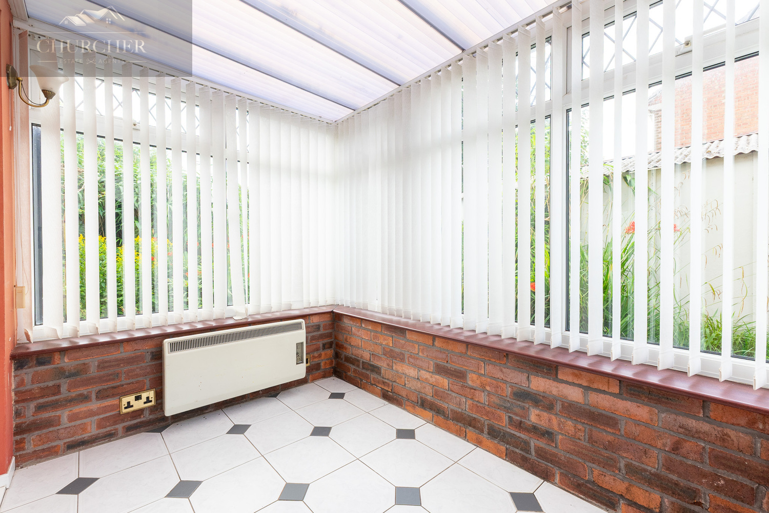 Leading off the dining room is the main lounge, a generously sized reception room with a calm, neutral palette, exposed beams, and a feature fireplace providing a central focal point. Sliding patio doors open into a bright conservatory, creating a lovely flow between indoor and outdoor spaces. The conservatory itself is fully glazed with vertical blinds and a tiled floor, offering a peaceful spot to enjoy views of the rear garden all year round.