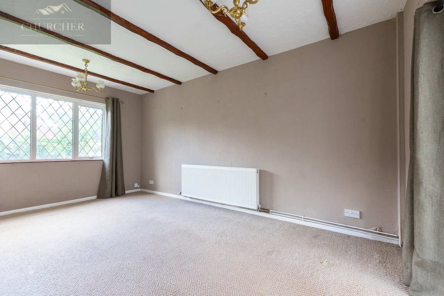 The home is accessed via a pedestrian gate that leads through a well-established front garden to the main entrance. Upon entering, you are welcomed into a bright and spacious dining room that enjoys views to the front of the property. With neutral tones, carpeted flooring and exposed ceiling beams, the space exudes a sense of warmth and offers flexibility to be used as a formal dining area, study or secondary reception room.