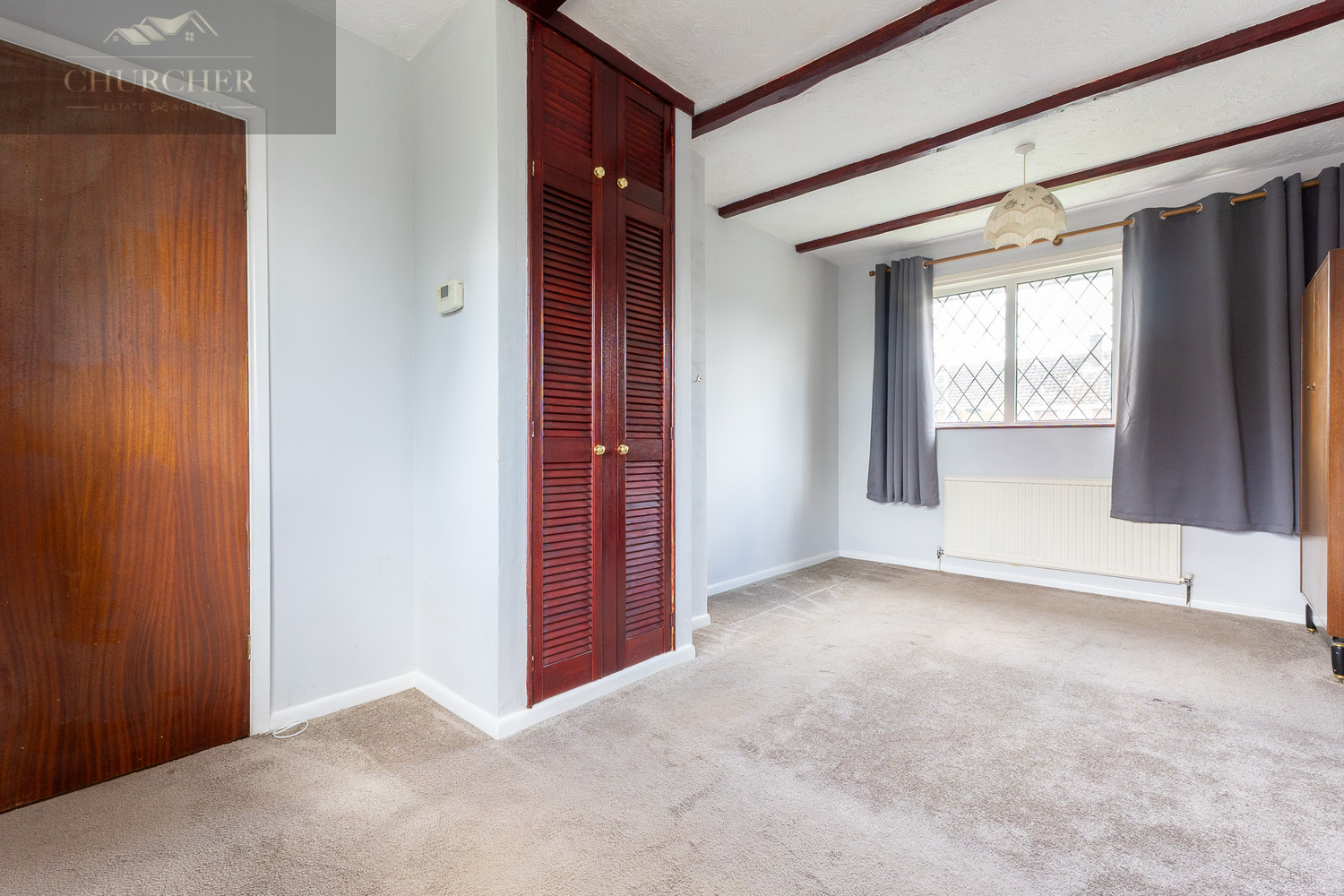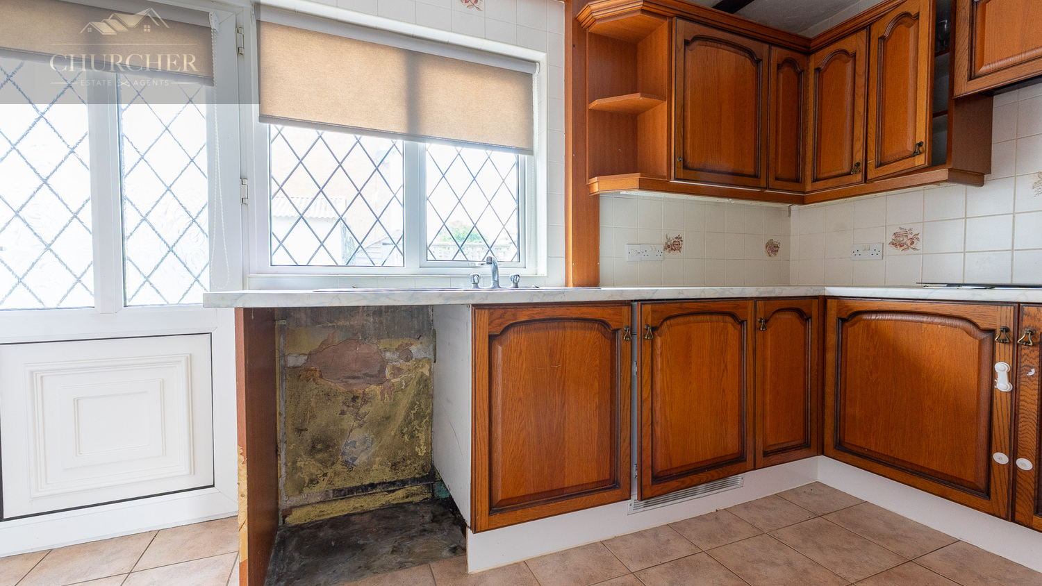 From here, the home flows naturally into the kitchen which is fitted with a comprehensive range of wooden wall and base units, tiled splashbacks and worktops. With dual-aspect windows and access to the rear garden, the kitchen is both practical and well-positioned at the heart of the home. Although some areas would benefit from modernisation, the space offers fantastic potential for a buyer to add their own stamp.