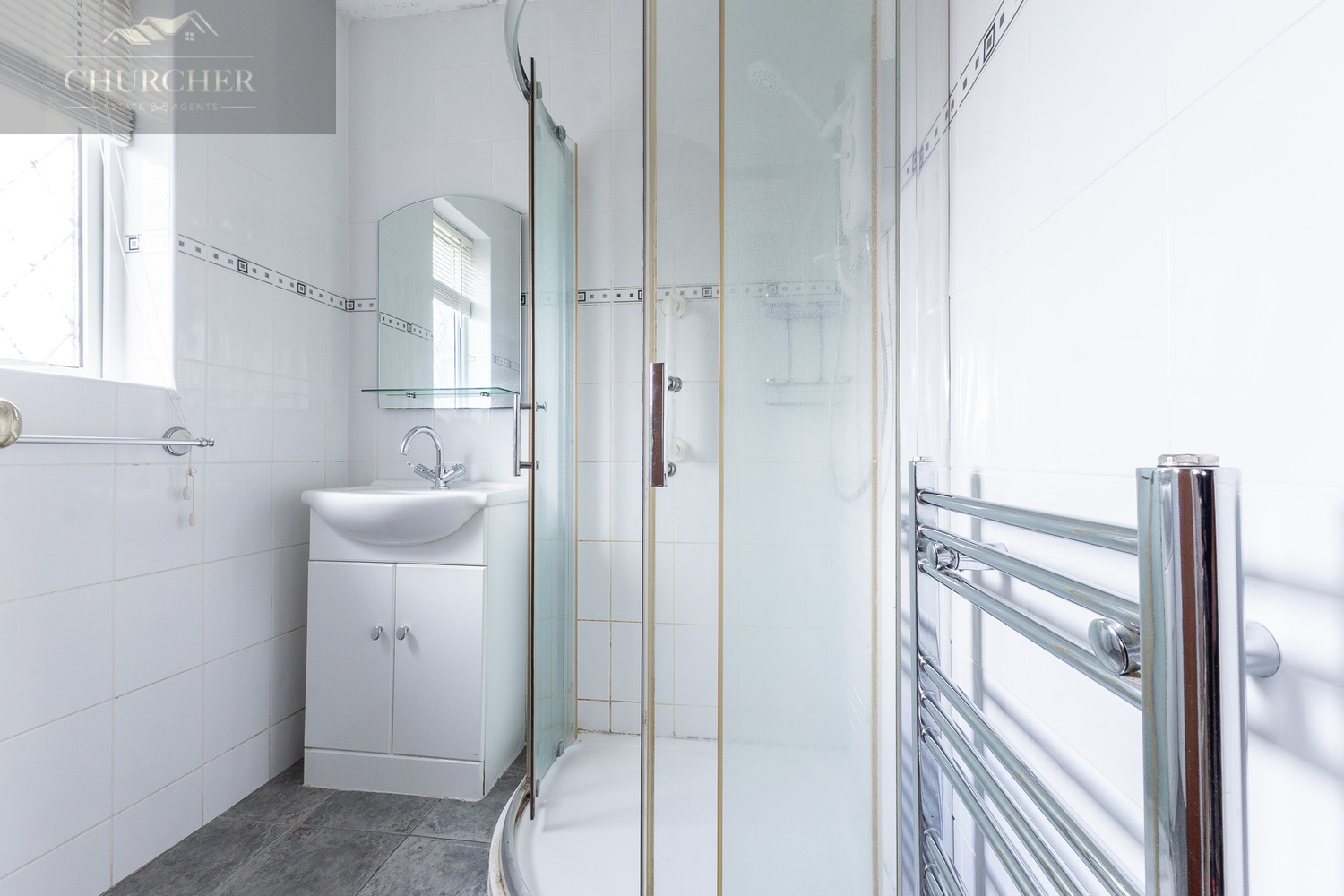 The first floor also houses a bright and neatly tiled shower room, complete with a corner shower enclosure, vanity sink unit, WC, and chrome towel rail.