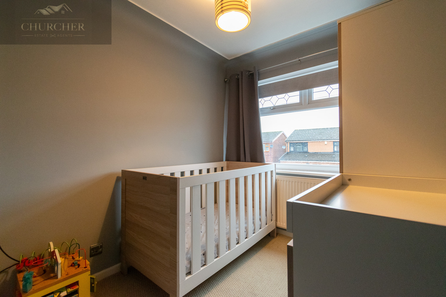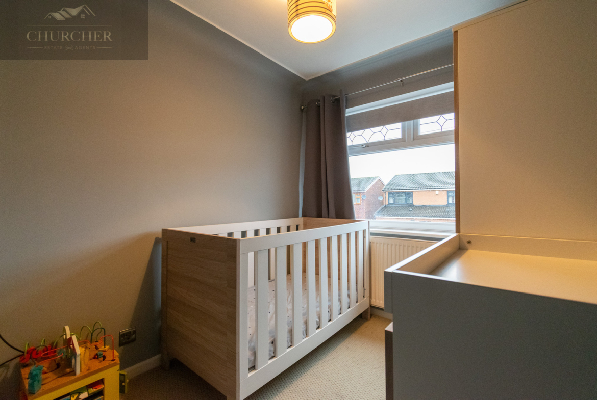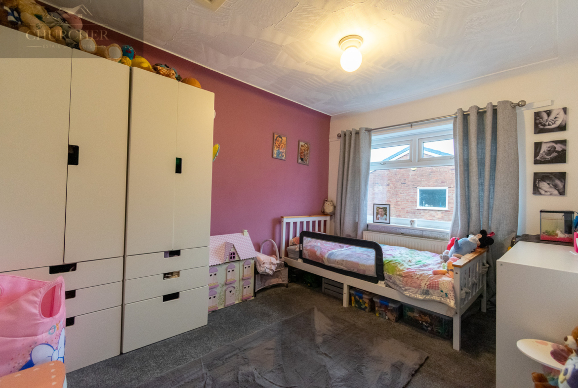 The second bedroom is another comfortable double, currently arranged as a child’s room, offering ample space for freestanding furniture and enjoying a pleasant rear aspect.