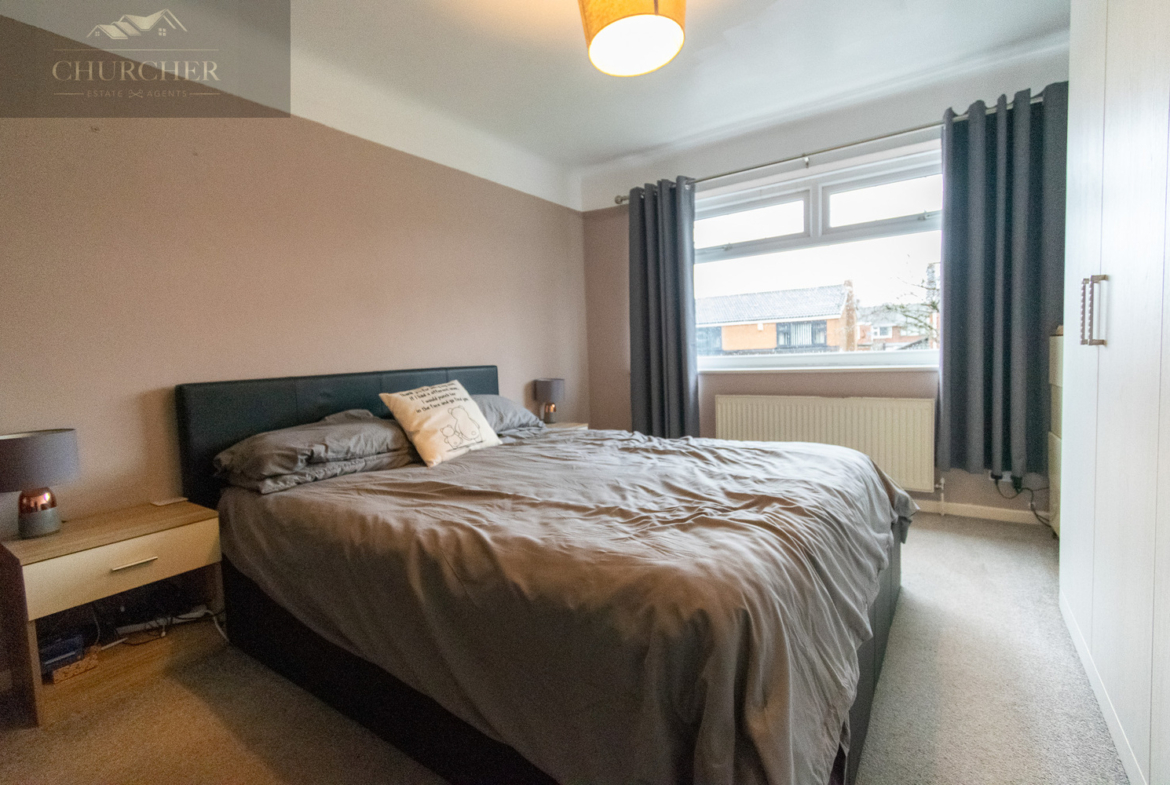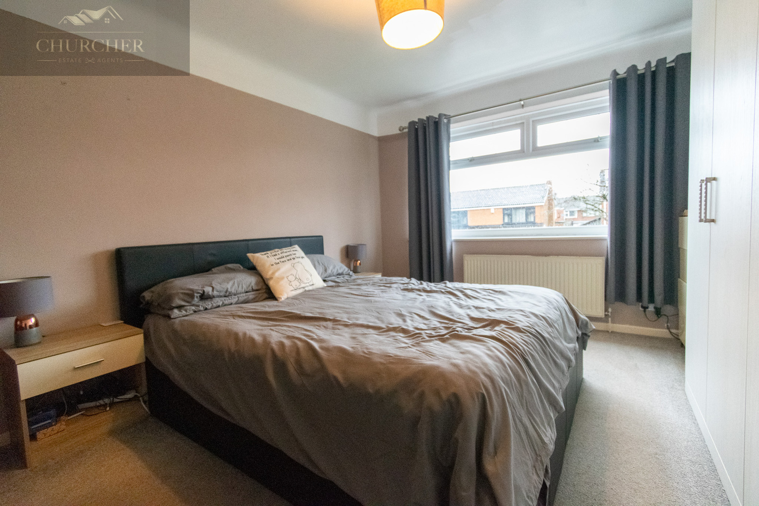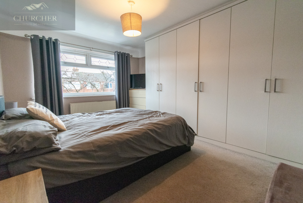 To the first floor, the property continues to impress with three well-appointed bedrooms. The main bedroom is a generous double, beautifully presented in neutral tones and benefitting from a full wall of fitted wardrobes, providing excellent storage. A large window allows natural light to fill the room, creating a calm and restful retreat.