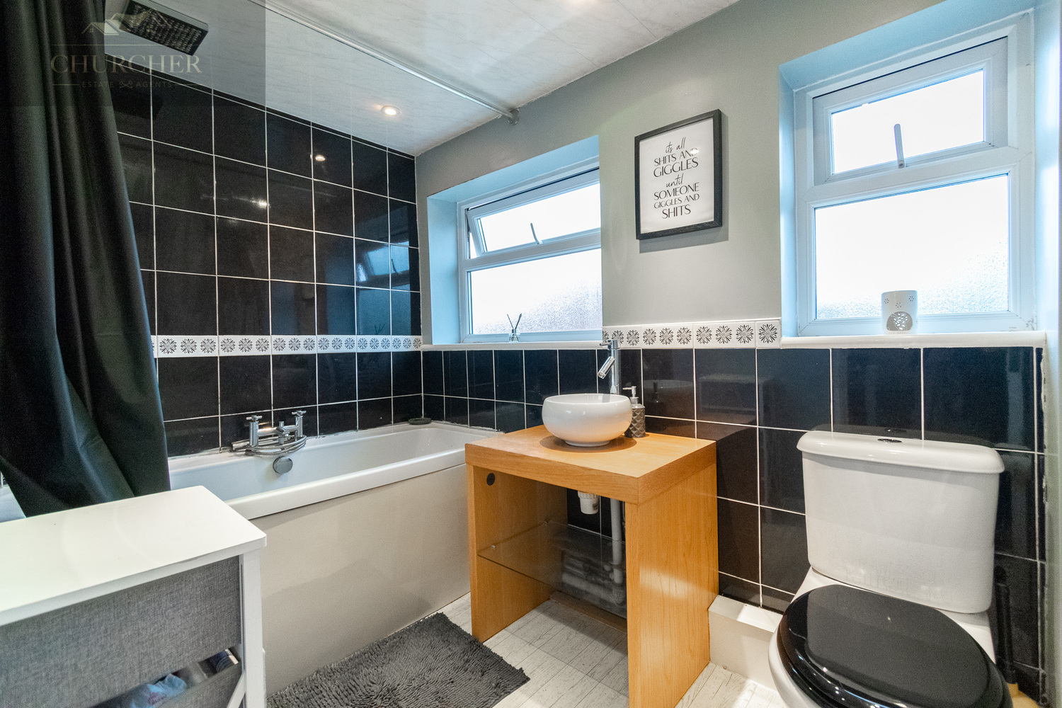 The family bathroom is fitted with a modern suite comprising a panelled bath with shower over, wash basin set upon a vanity unit and WC. Contemporary tiling and dual windows create a bright and practical space for everyday family living.