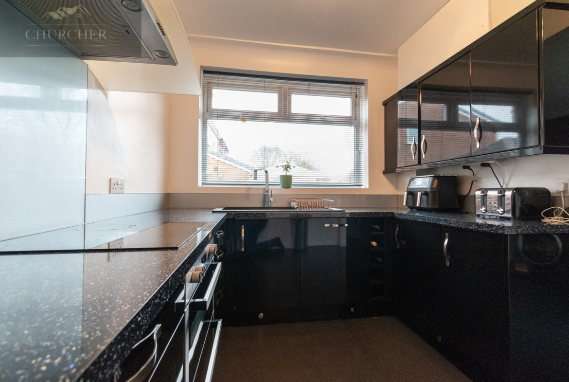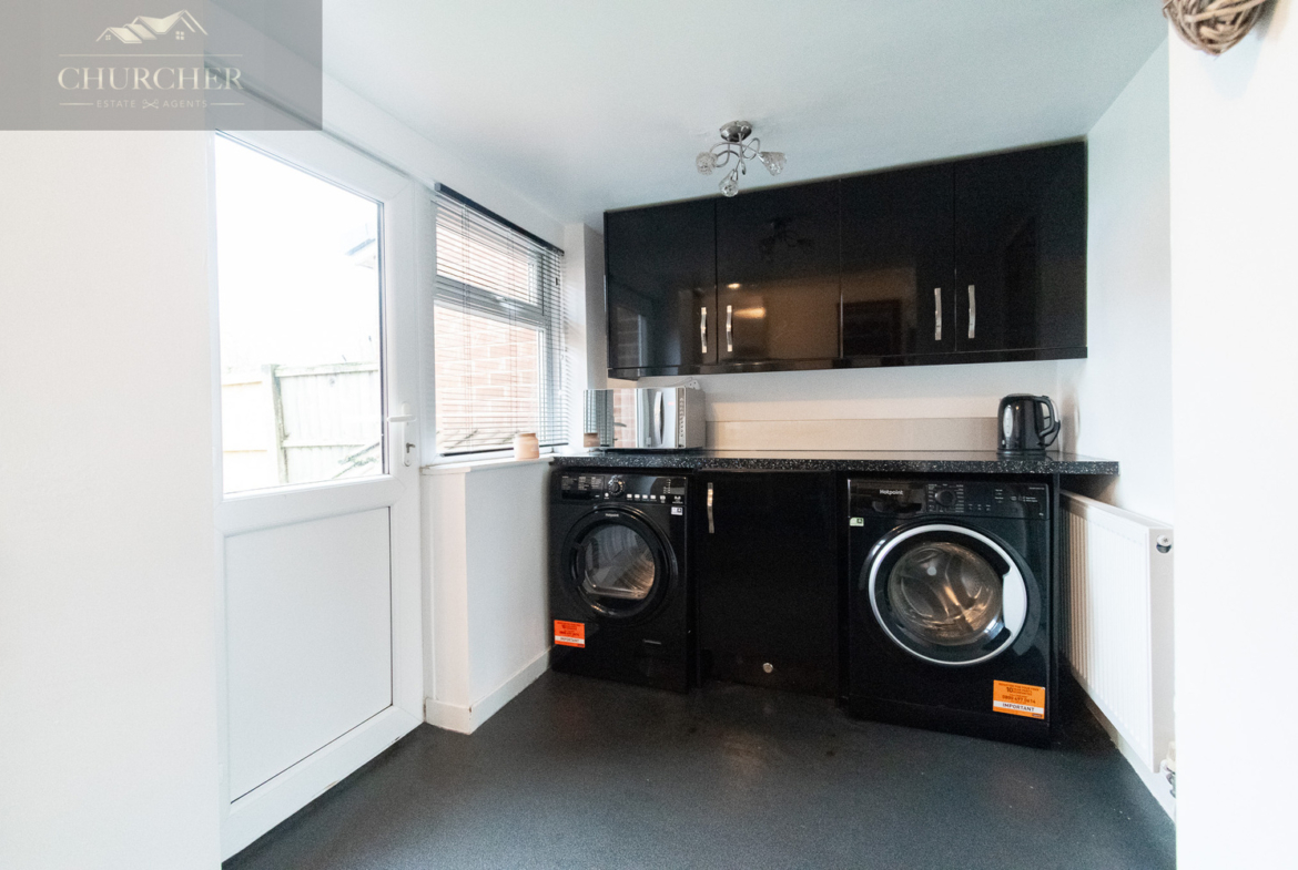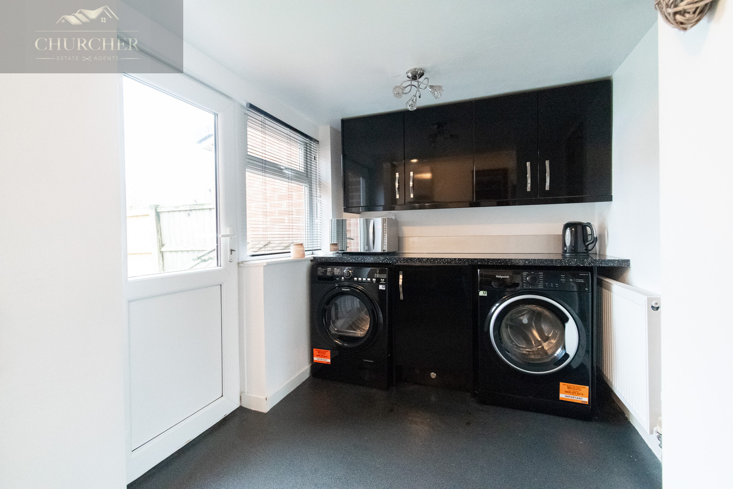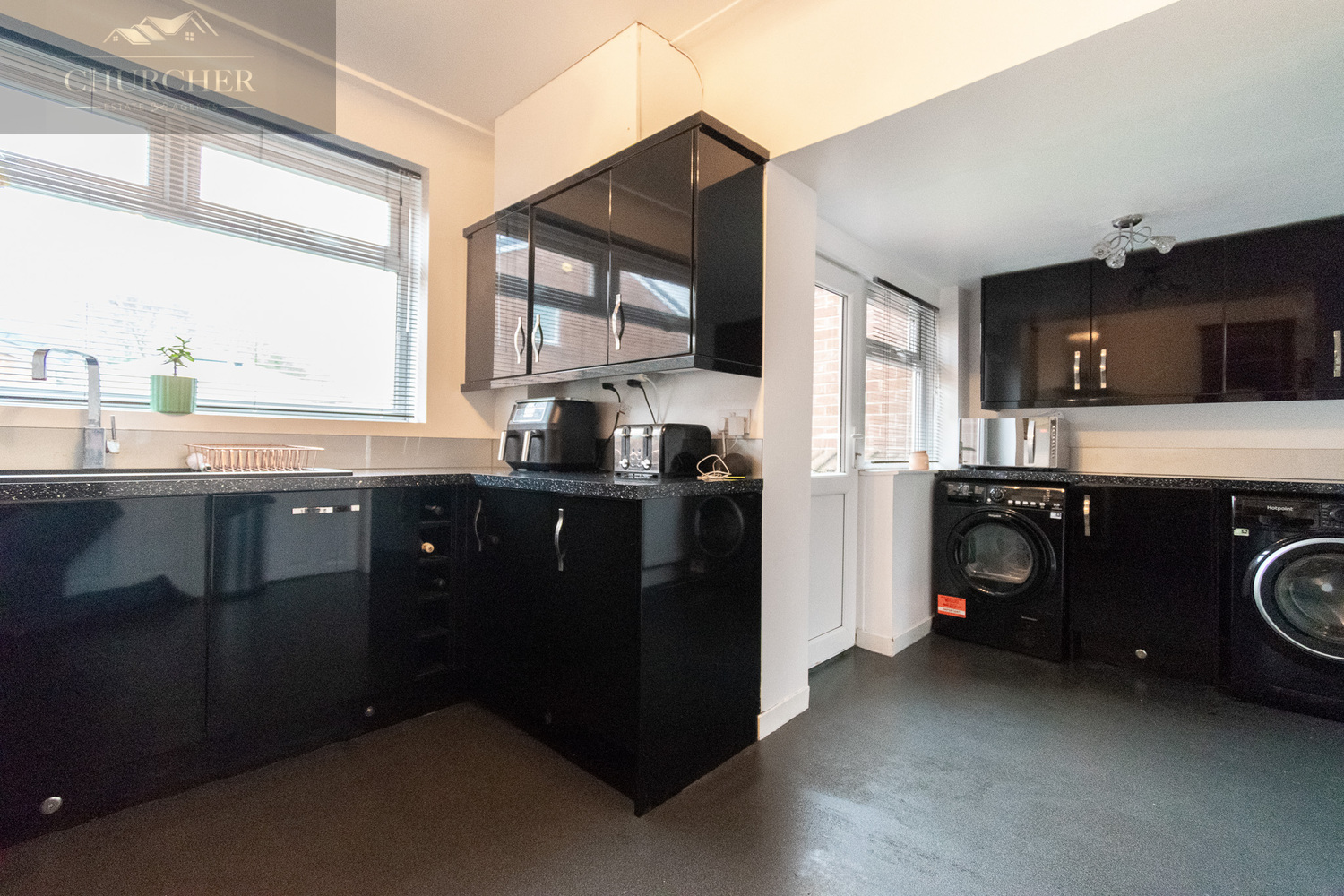 To the rear, the kitchen is fitted with sleek high-gloss cabinetry, contrasting work surfaces and integrated appliances including oven, hob and extractor. The layout provides excellent storage and preparation space, while a rear-facing window overlooks the garden. From here, access leads through to a separate utility room, complete with additional cabinetry, space for laundry appliances and a door providing convenient external access.