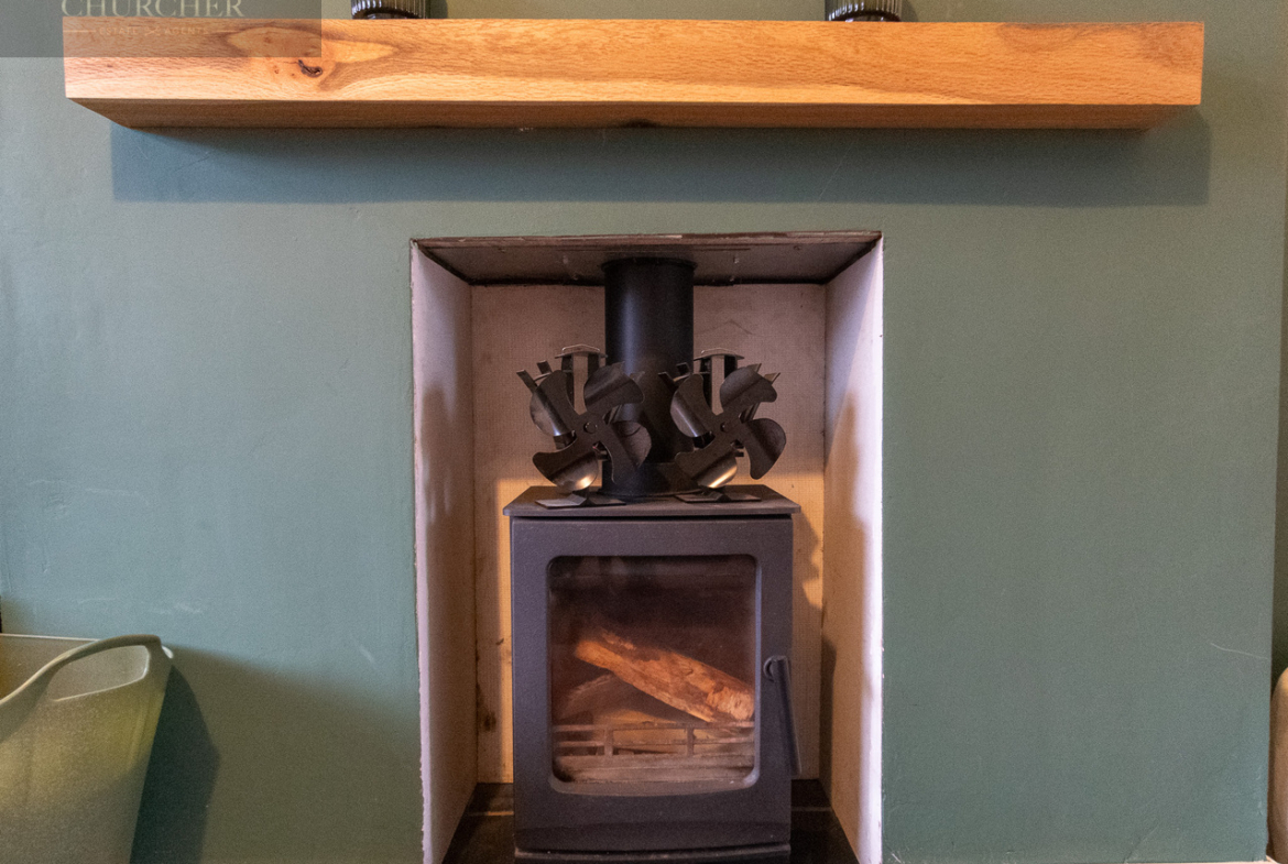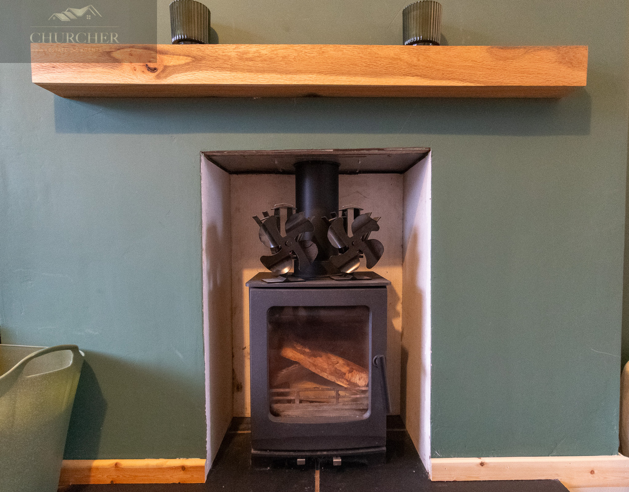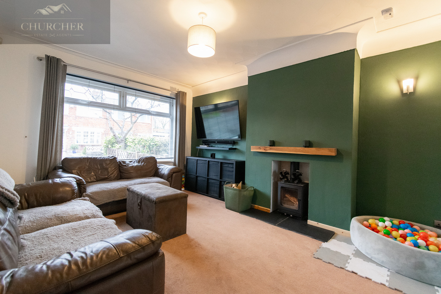 To the front, the lounge is a warm and inviting space centred around a contemporary inset log-burning stove with a timber mantle and slate hearth. A large window draws in plenty of natural light, enhancing the cosy yet spacious atmosphere – perfect for relaxing evenings with family.