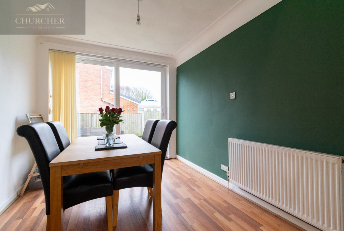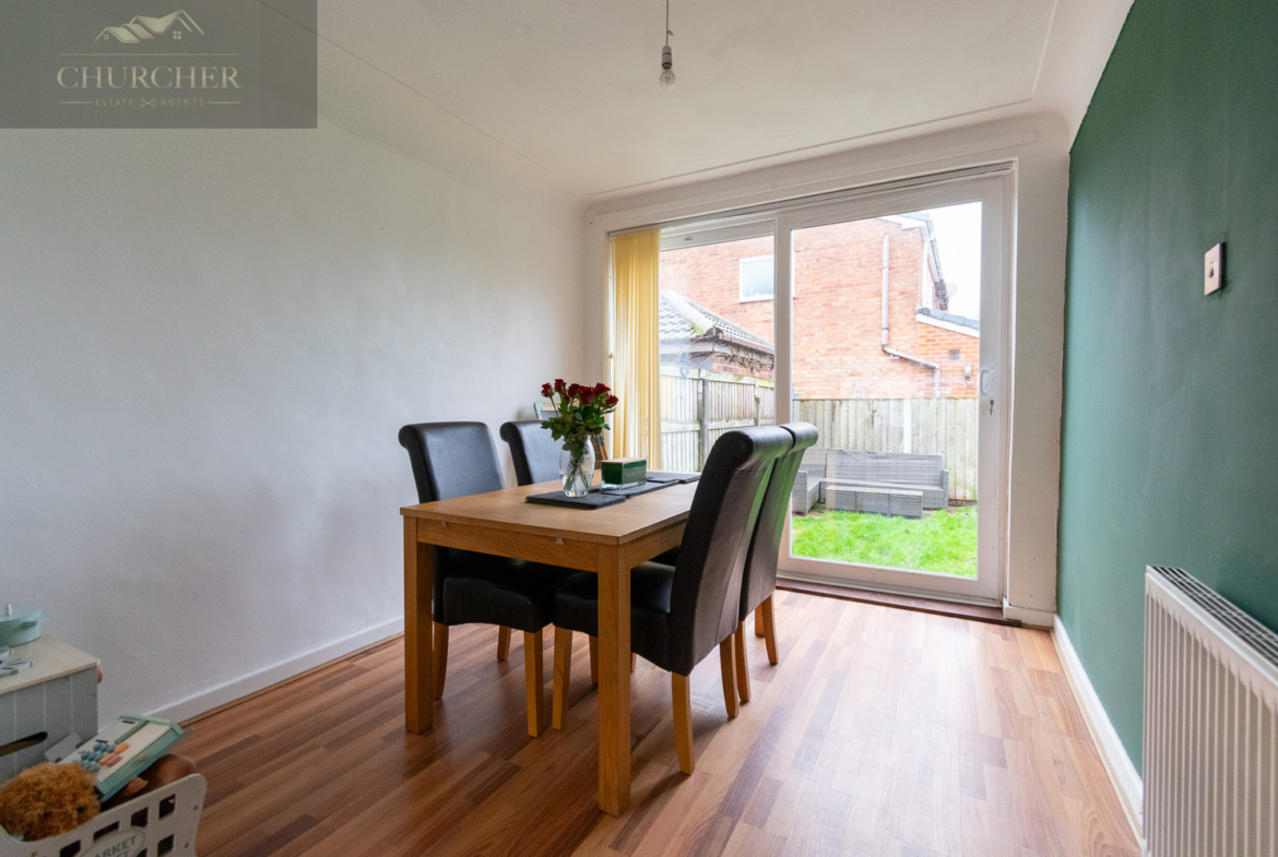 Adjacent sits a separate reception room, offering valuable flexibility. Currently used as a dining area, this adaptable space could equally serve as a playroom or additional sitting room. Sliding patio doors open directly onto the rear garden, allowing natural light to flood the room and creating a seamless connection between indoor and outdoor living during the warmer months.