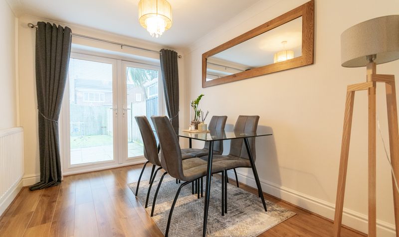 To the rear of the property, the dining room provides a wonderful space for family meals and gatherings, positioned perfectly beside the French doors which open directly onto the garden. The connection between indoor and outdoor living is effortless, allowing the room to feel bright and airy throughout the day.