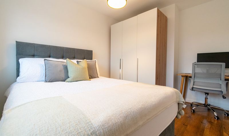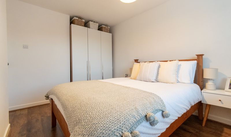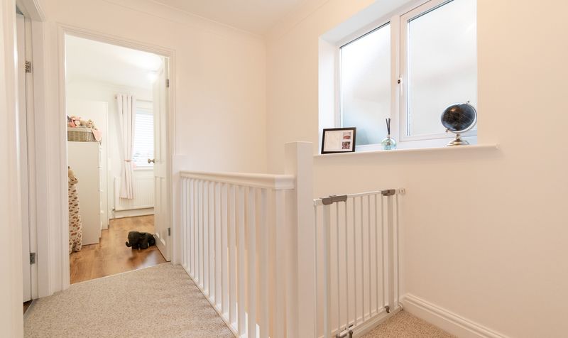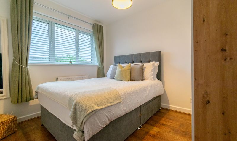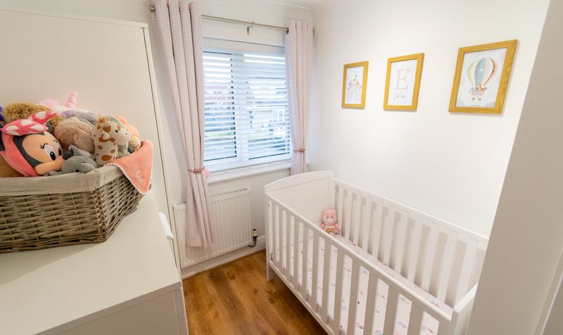 Ascending to the first floor, the property continues to impress with three well-proportioned bedrooms, each presented in a fresh and calming style. The main bedroom is a comfortable and spacious retreat, beautifully styled with soft furnishings and offering ample space for wardrobes and additional furniture. The second double bedroom is equally inviting, featuring a large window and a peaceful outlook, making it ideal for guests or family members. The third bedroom is a versatile space, currently arranged as a charming nursery, and would also suit a home office or child’s bedroom depending on lifestyle needs.
