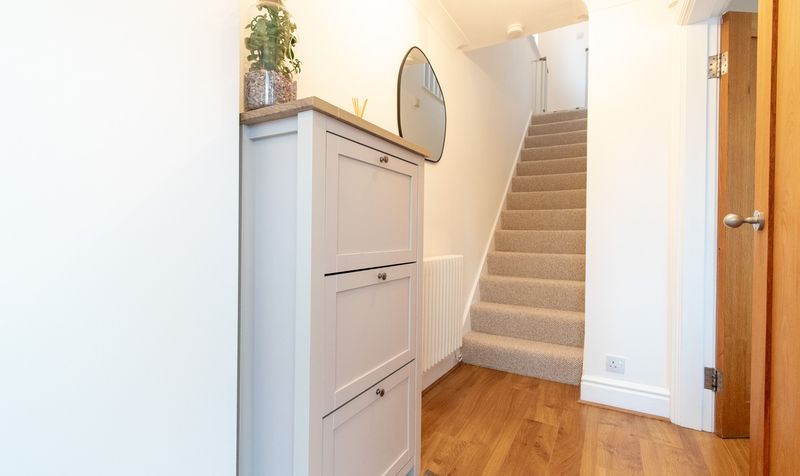 Upon arrival, the home immediately impresses with its attractive frontage, generous driveway parking and an integral garage, providing both convenience and excellent storage. Stepping through the front door, you are welcomed into a bright and inviting entrance hallway, finished with warm wood-effect flooring and a contemporary neutral décor that sets the tone for the rest of the home. The staircase rises neatly ahead, creating a practical and well-organised first impression.