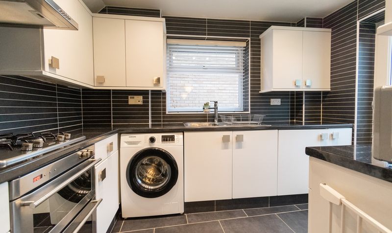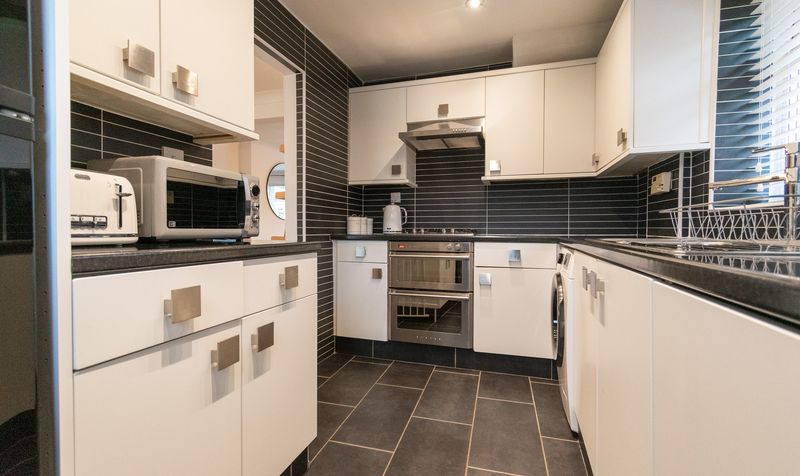Adjoining the dining room is the modern fitted kitchen, finished in crisp white cabinetry with contrasting dark worktops and sleek tiled splashbacks. The kitchen has been designed with both style and functionality in mind, offering excellent storage, generous preparation space and direct access to the rear via a side door, ideal for everyday practicality.