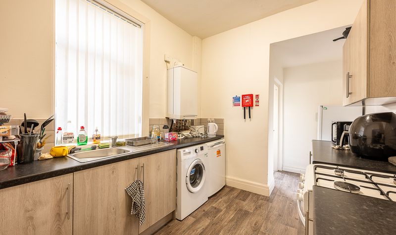 Continuing toward the back of the property, the kitchen is fitted with a range of modern wall and base units with contrasting worktops, offering practical storage and plenty of preparation space. The room provides an efficient layout for day-to-day cooking, while remaining bright and functional, with space for key appliances and everything needed for modern living. Beyond the kitchen, the ground floor is further enhanced by useful additional facilities including a WC and bathroom, adding everyday convenience for occupants and helping to support strong rental appeal.