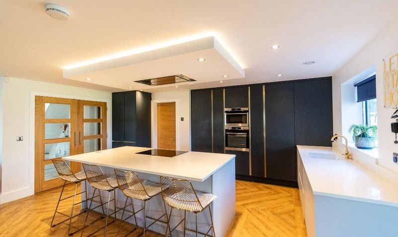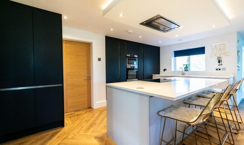 The ground floor offers a wonderful sense of space and flow, centred around a stunning open-plan kitchen and family room extending across the full rear of the home. Bathed in natural light through expansive windows and doors opening onto the garden, this spectacular room provides the perfect space for family living, dining and entertaining. The contemporary kitchen is beautifully appointed with sleek cabinetry, integrated appliances, and generous workspace, all seamlessly connected to the family room for a sociable and stylish environment.